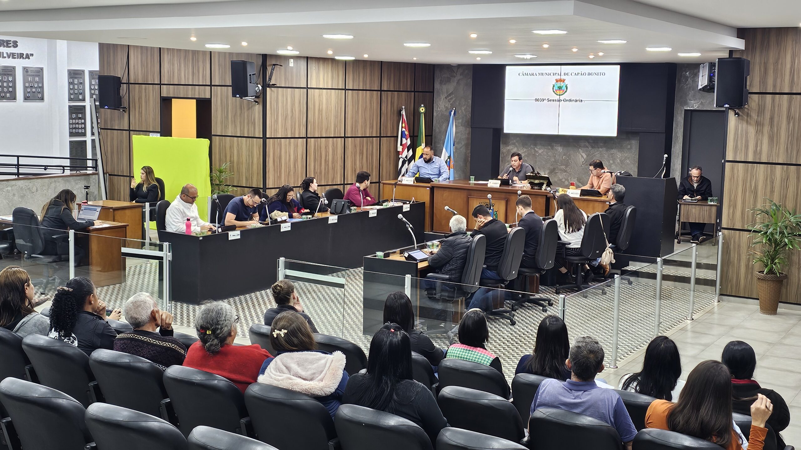 Em noite que contou com ampla participação popular no Plenário da Câmara Municipal, além da presença de representantes da Polícia Militar, a Ordem do Dia da 39ª Sessão Ordinária trouxe a discussão e votação de oito Proposições, além de sete Indicações apresentadas pelos Vereadores e encaminhadas ao Executivo pela