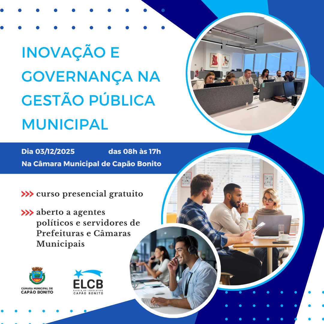 A Câmara Municipal de Capão Bonito convida agentes políticos e servidores das Prefeituras e Câmaras Municipais de Capão Bonito e região, para participarem do curso gratuito “Inovação e Governança na Gestão Pública Municipal”, que será realizado no próximo dia 03/12, das 08h às 17h, no Plenário da Câmara. PROGRAMA