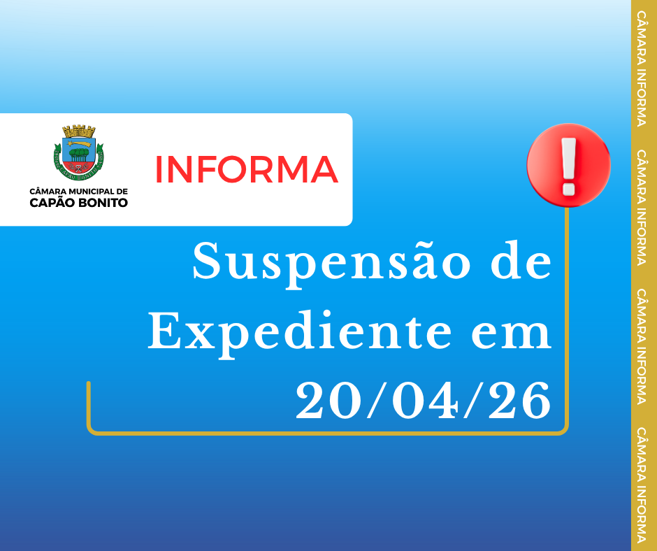 Ficará suspenso o expediente da Câmara Municipal de Capão Bonito no dia 20/04/2026, conforme o Decreto Municipal 047/2026, retornando no dia 22/04/2026, às 09h. A próxima Sessão Ordinária será realizada no dia 22/04, às 19h.