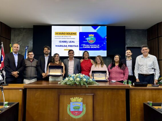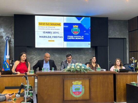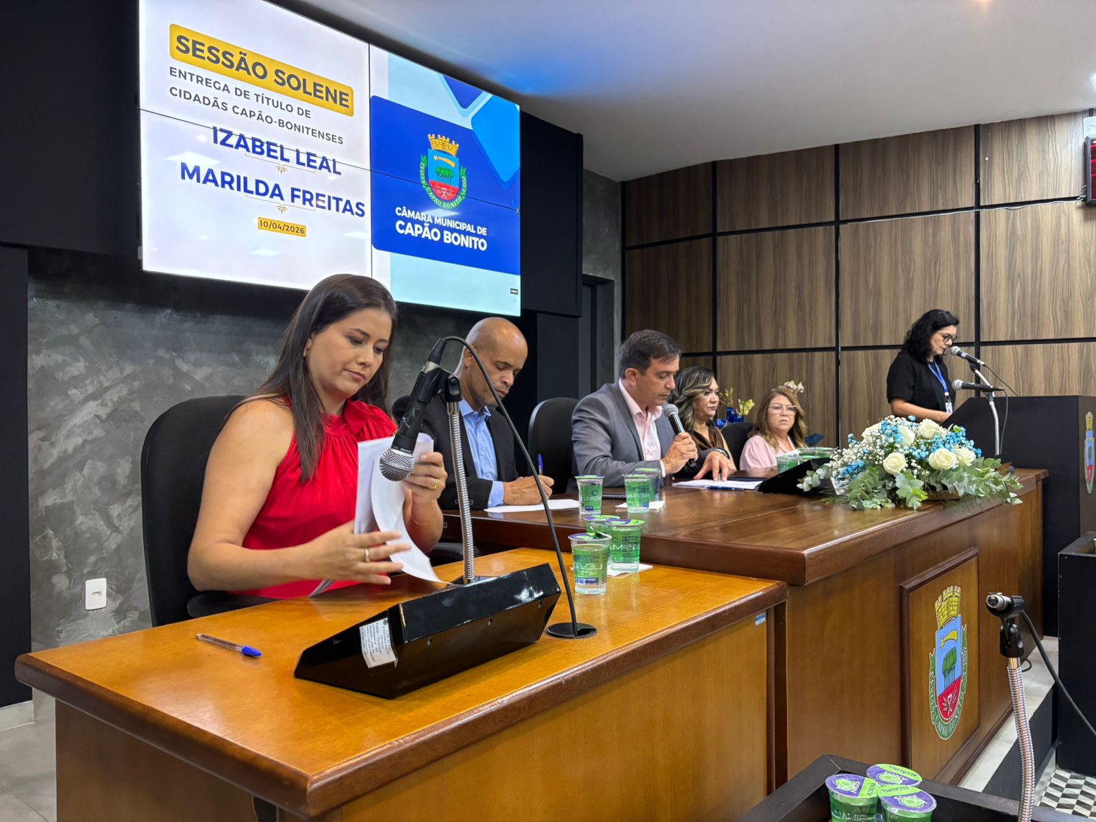 A Câmara Municipal de Capão Bonito procedeu a entrega dos Títulos de Cidadãs Capão-bonitenses às senhoras Izabel Leal e Marilda Freitas, em Sessão Solene realizada no dia 10 de abril de 2026, no Plenário da Câmara.