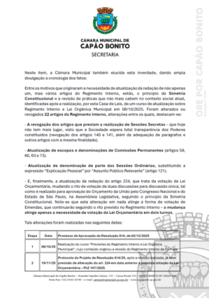 A Câmara Municipal de Capão Bonito, em observância ao princípio da transparência e diante de informações veiculadas pelo Jornal O Expresso nas suas edições de 16/01 e 23/01/26, a respeito do rito de votação do PLE (Projeto de Lei do Executivo) 107/2025, vem a público prestar os seguintes esclarecimentos.