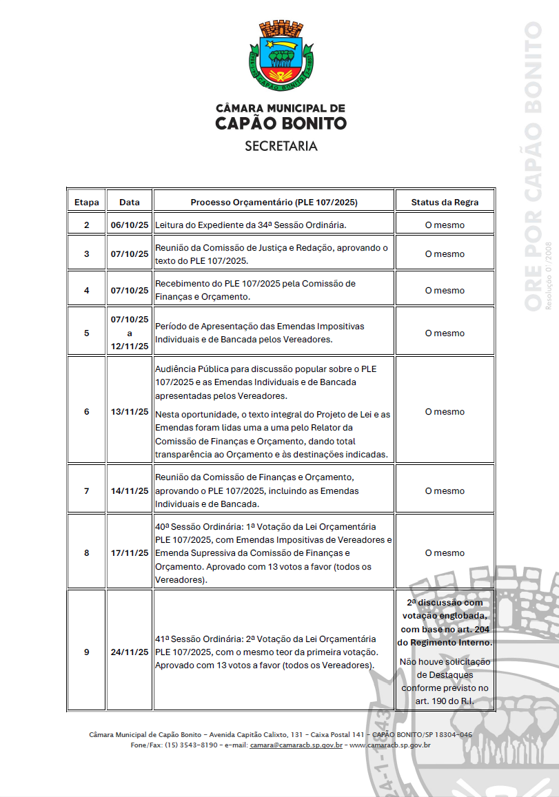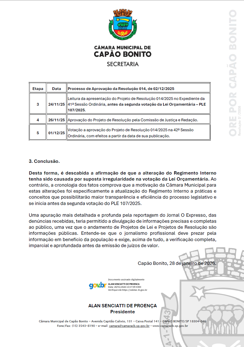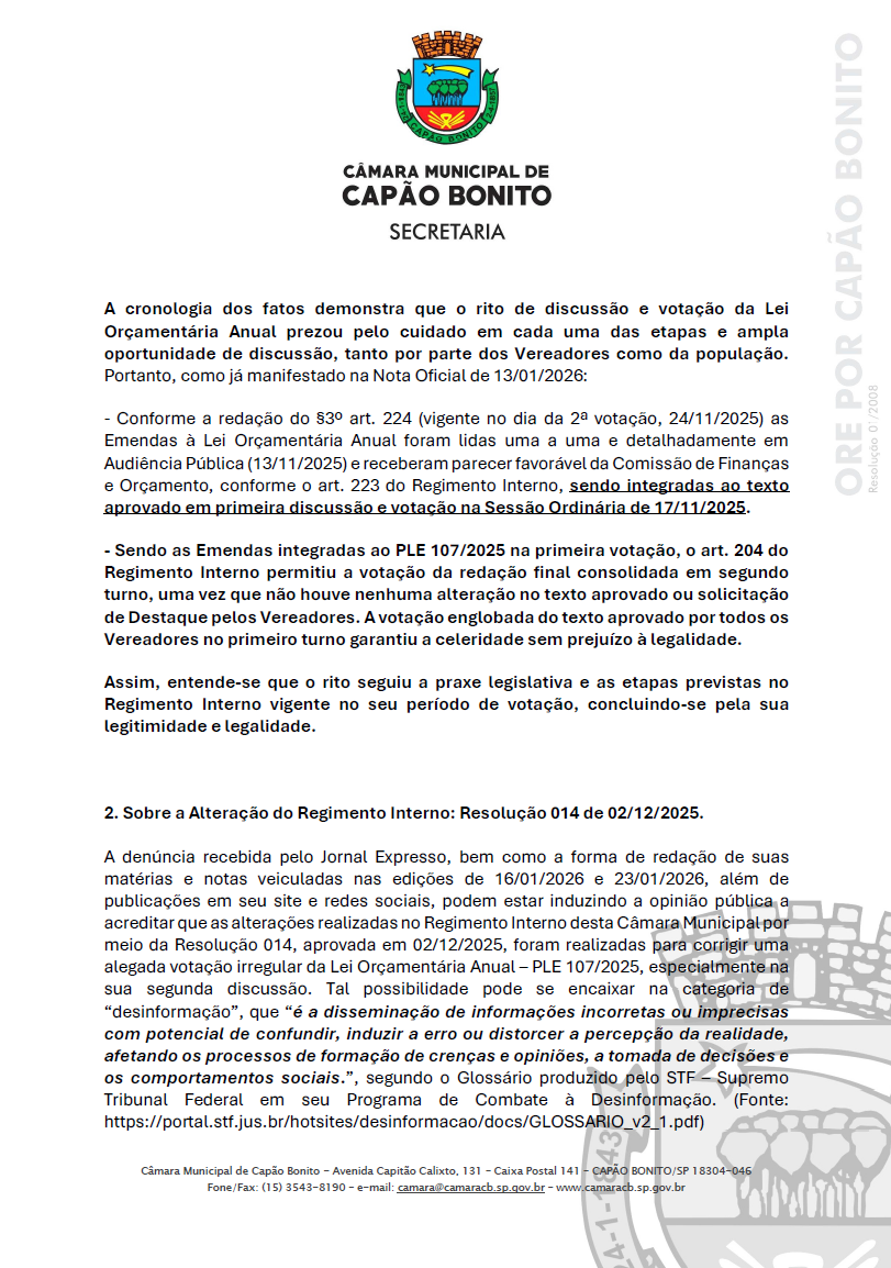 A Câmara Municipal de Capão Bonito, em observância ao princípio da transparência e diante de informações veiculadas pelo Jornal O Expresso nas suas edições de 16/01 e 23/01/26, a respeito do rito de votação do PLE (Projeto de Lei do Executivo) 107/2025, vem a público prestar os seguintes esclarecimentos.